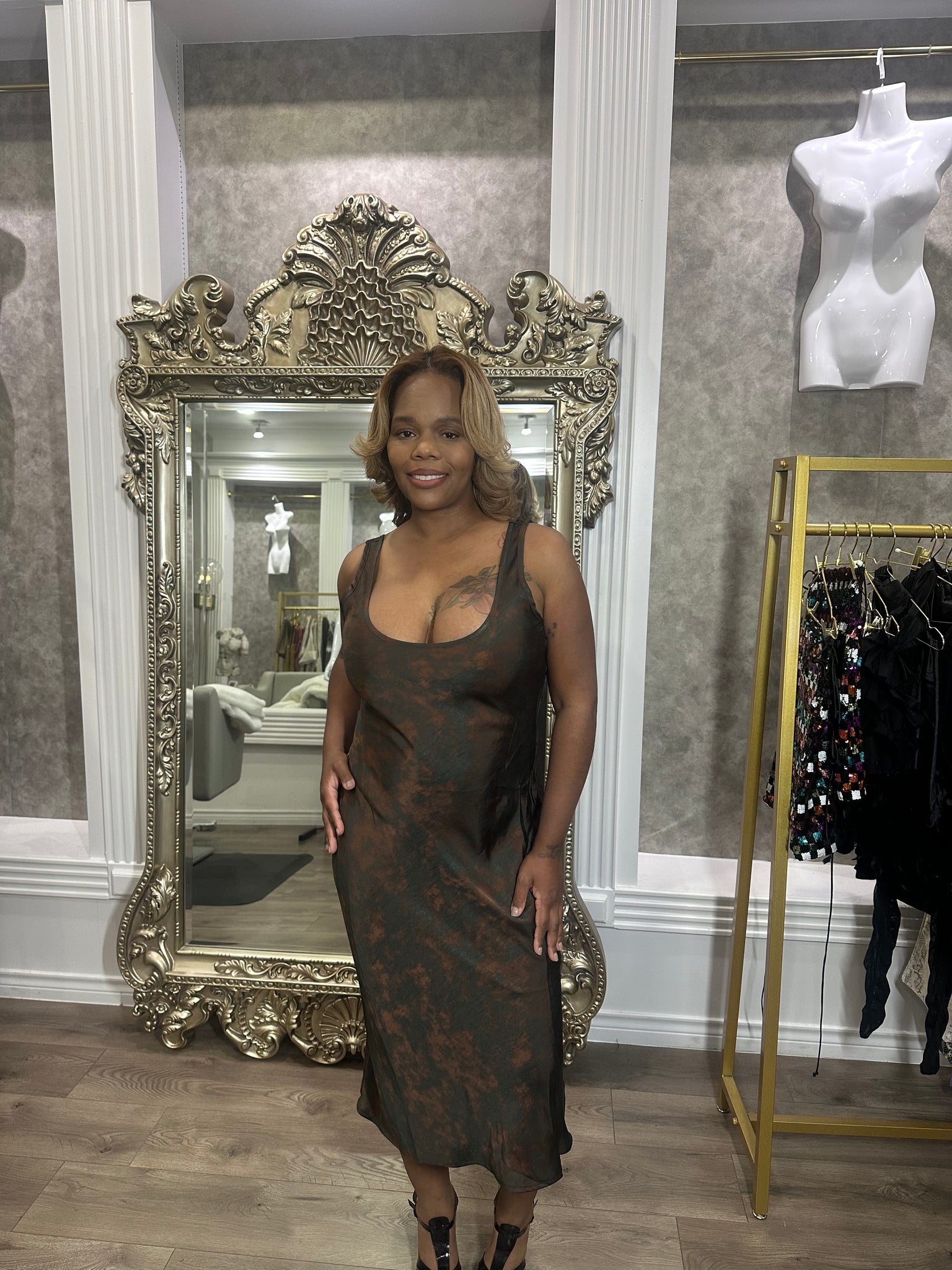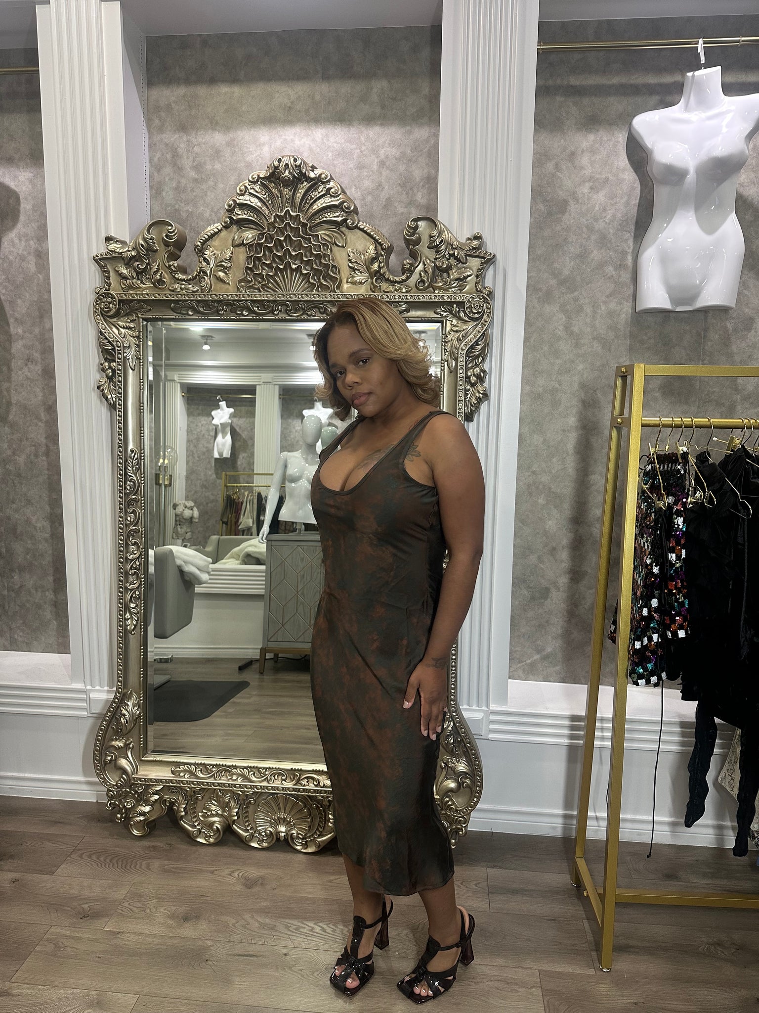 All over print satin midi slip dress. Perfect for brunch or date night.
