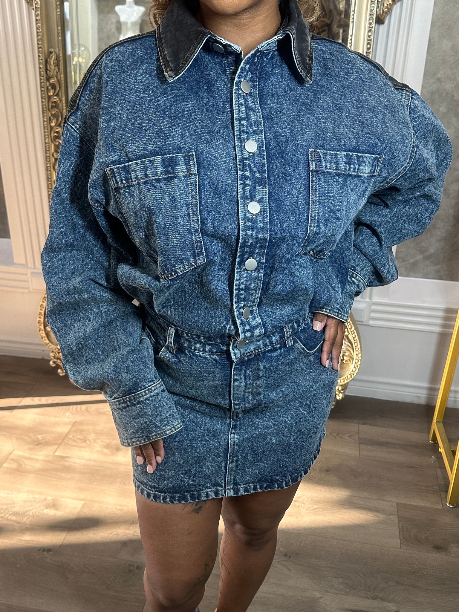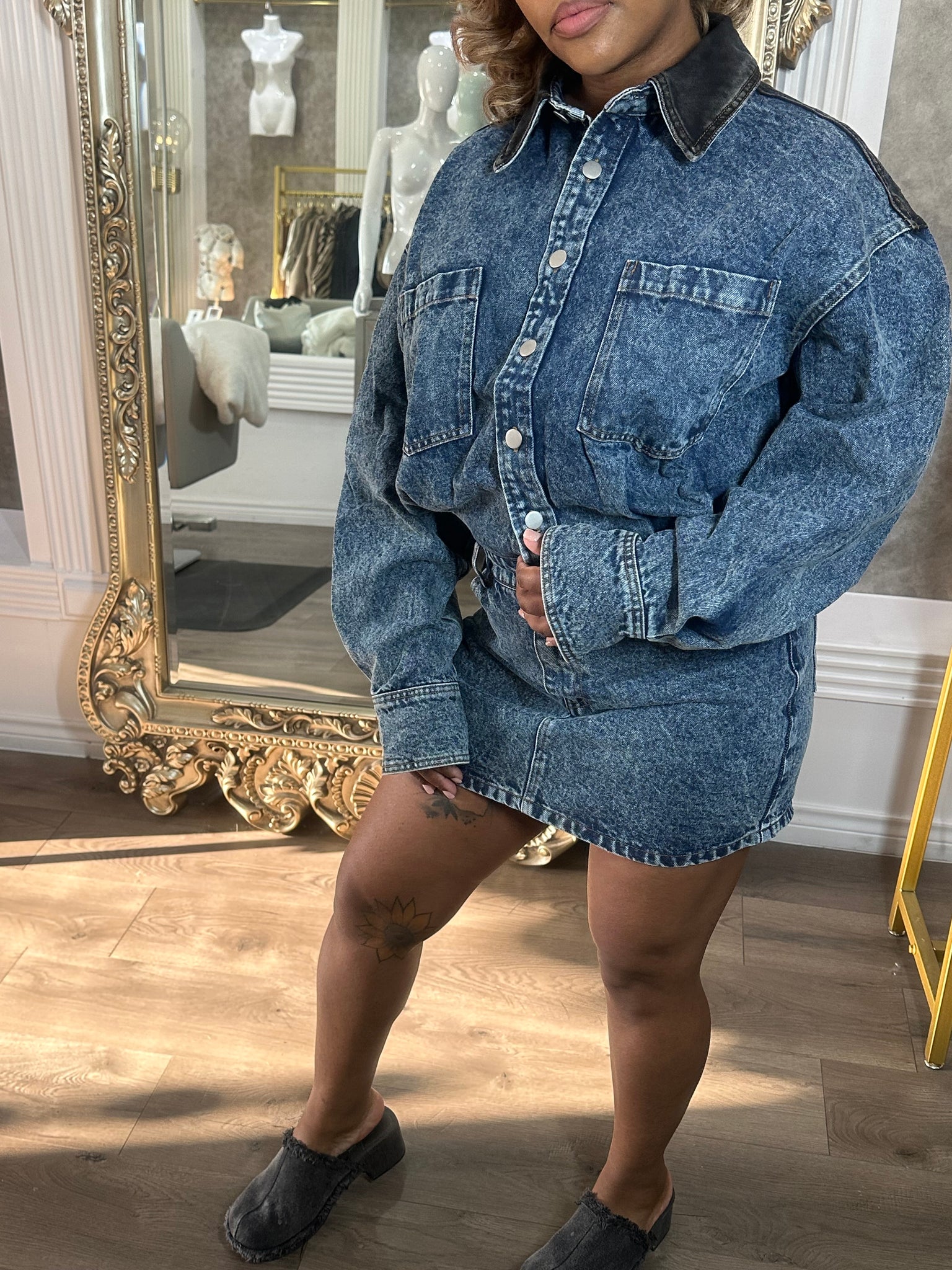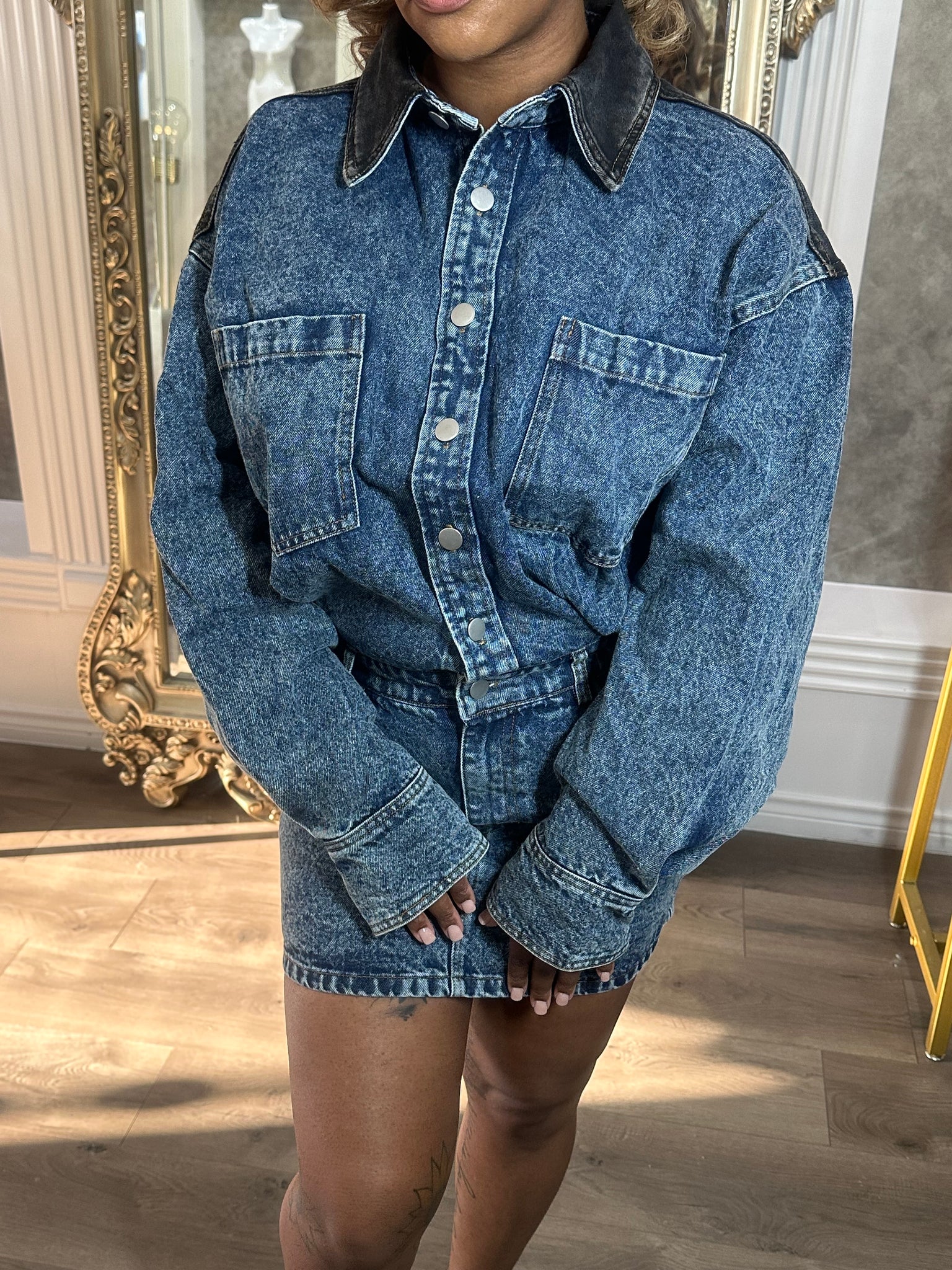 Button up denim dress with black panel at the shoulders and collar. Oversized top fit with long sleeves.