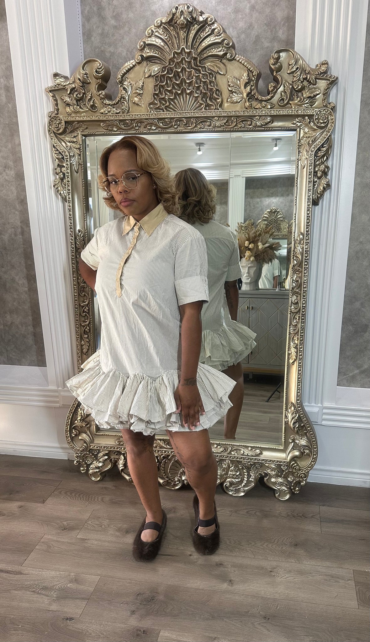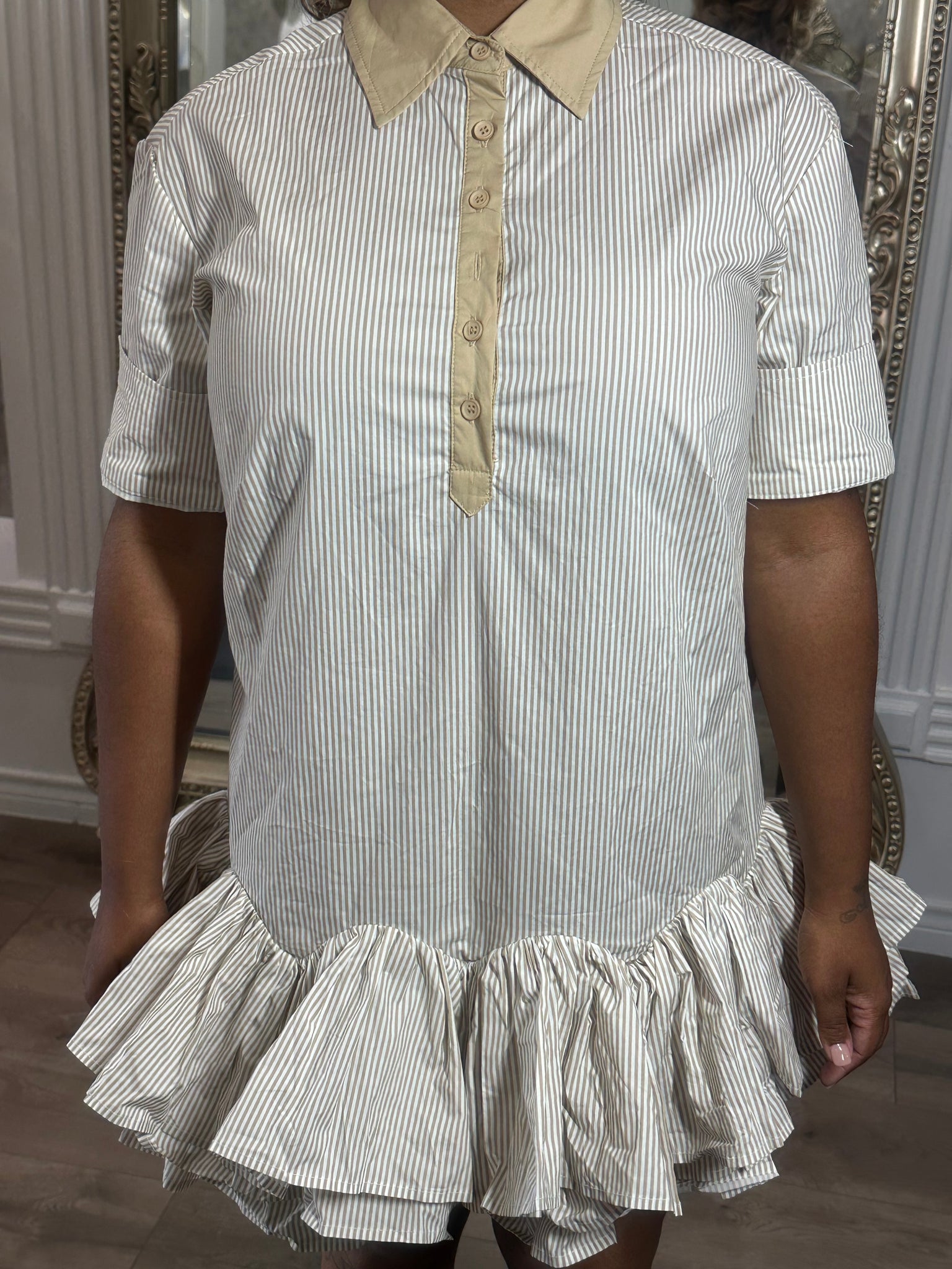 The perfect shirt dress with ruffles at hem for added flair. Features an all over striped design and front button up closure.