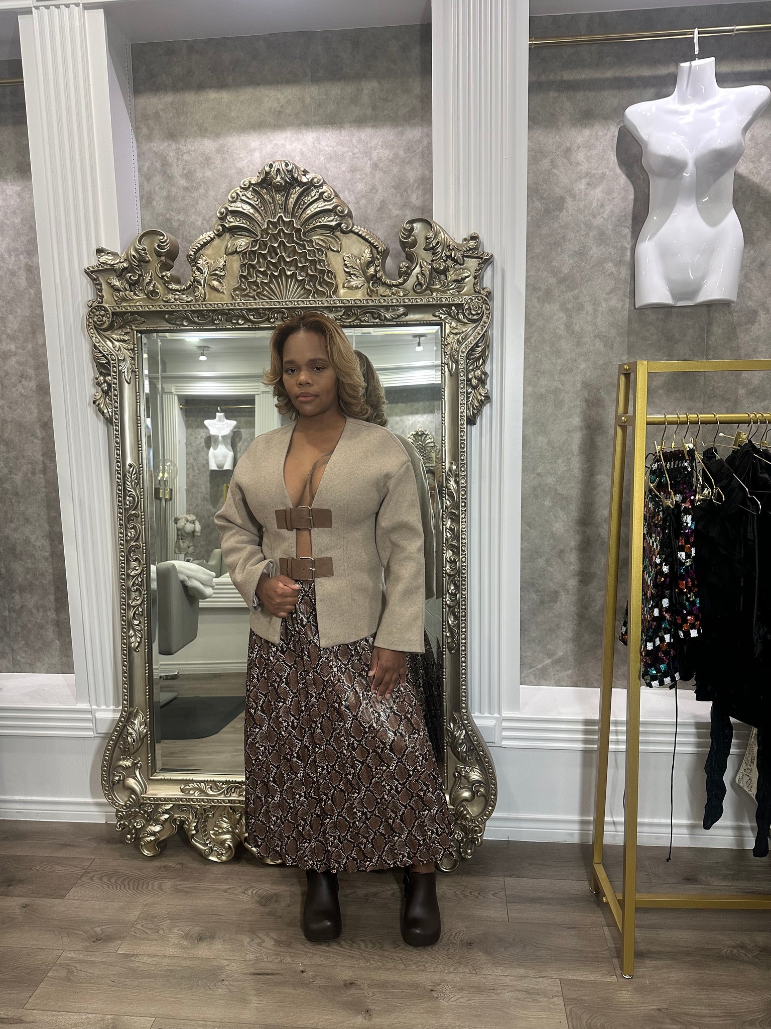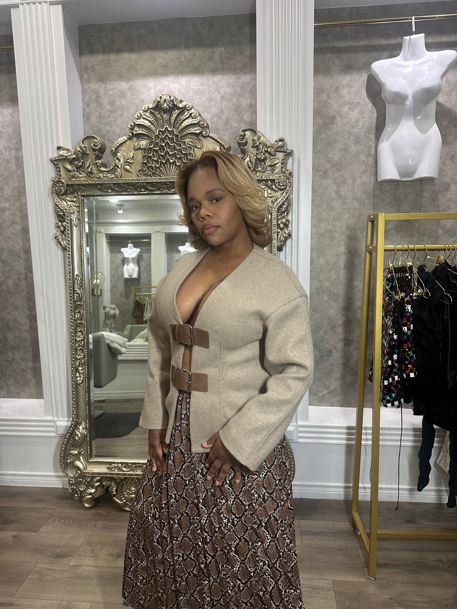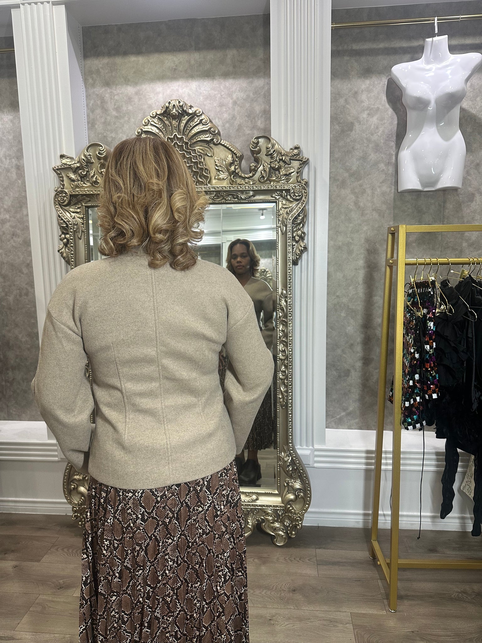 This jacket is crafted from soft, luxurious mohair and features a belted closure for a tailored fit. With its structured design and long sleeves, this versatile jacket is perfect for both casual and formal settings, offering a sophisticated and polished look.