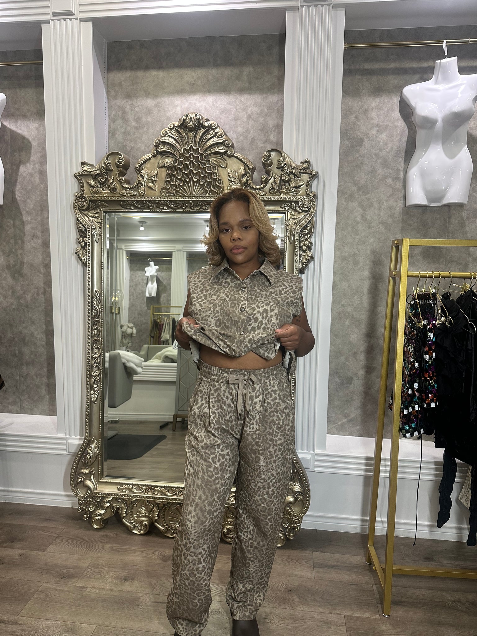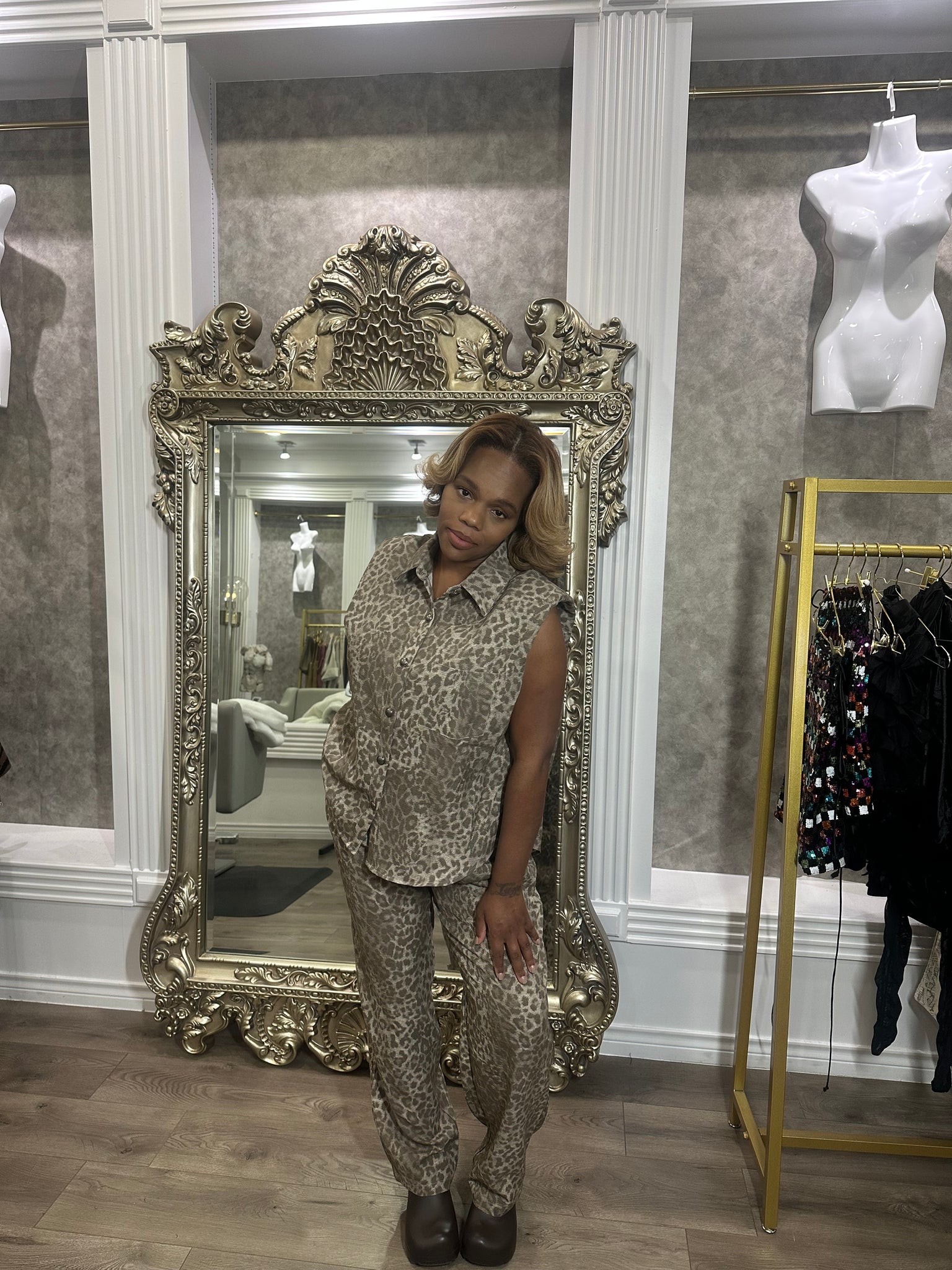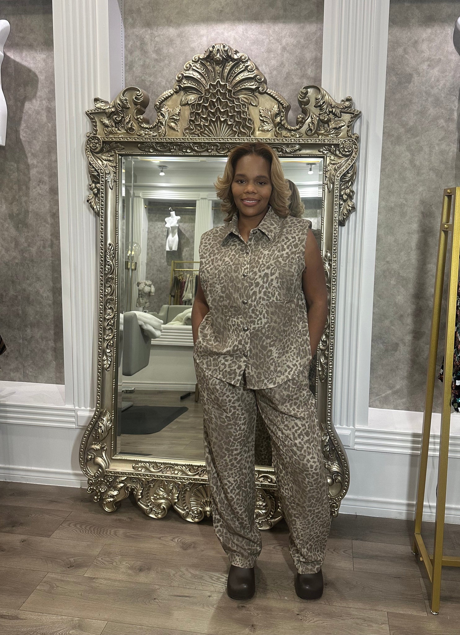Elevate your wardrobe with this sleeveless button-down with padded shoulders and wide-leg pant set in a chic leopard print. Effortlessly blending comfort and sophistication, it is designed for versatile styling from day to night.